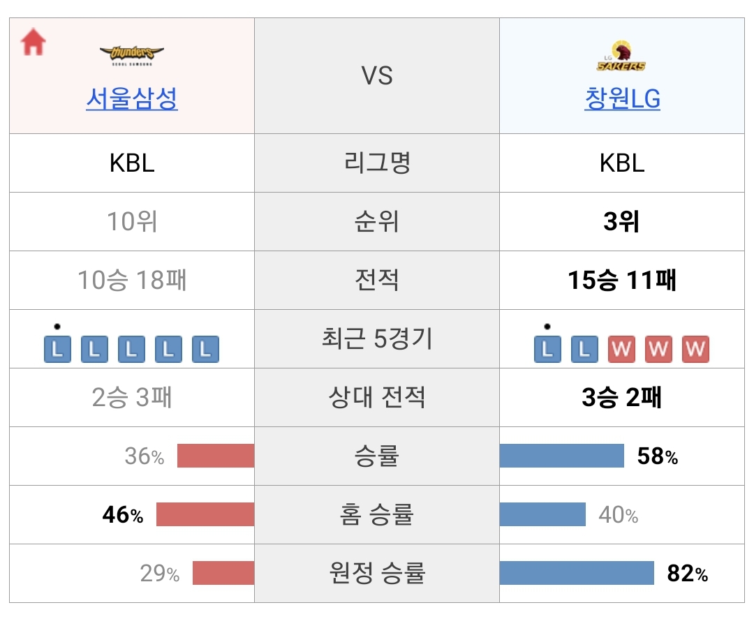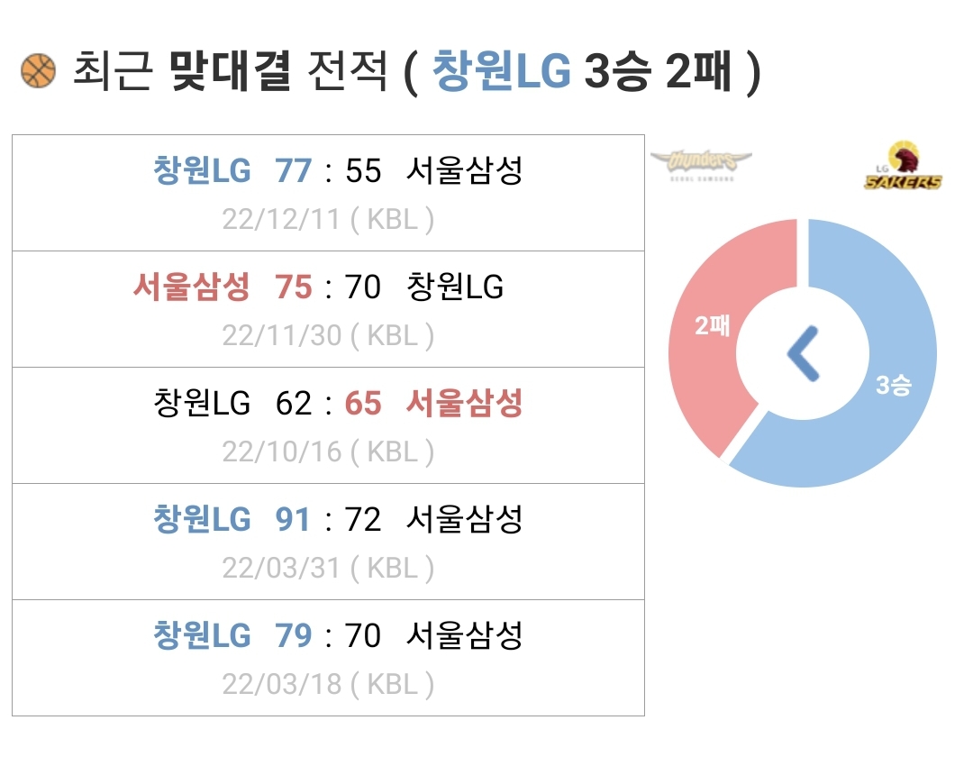 맞대결 전적은 서로 비슷한 수준이지만 현재 경기력 및 분위기를 합산해보면 창원LG가 더 유리한 수준에 경기를 치룰것이다.