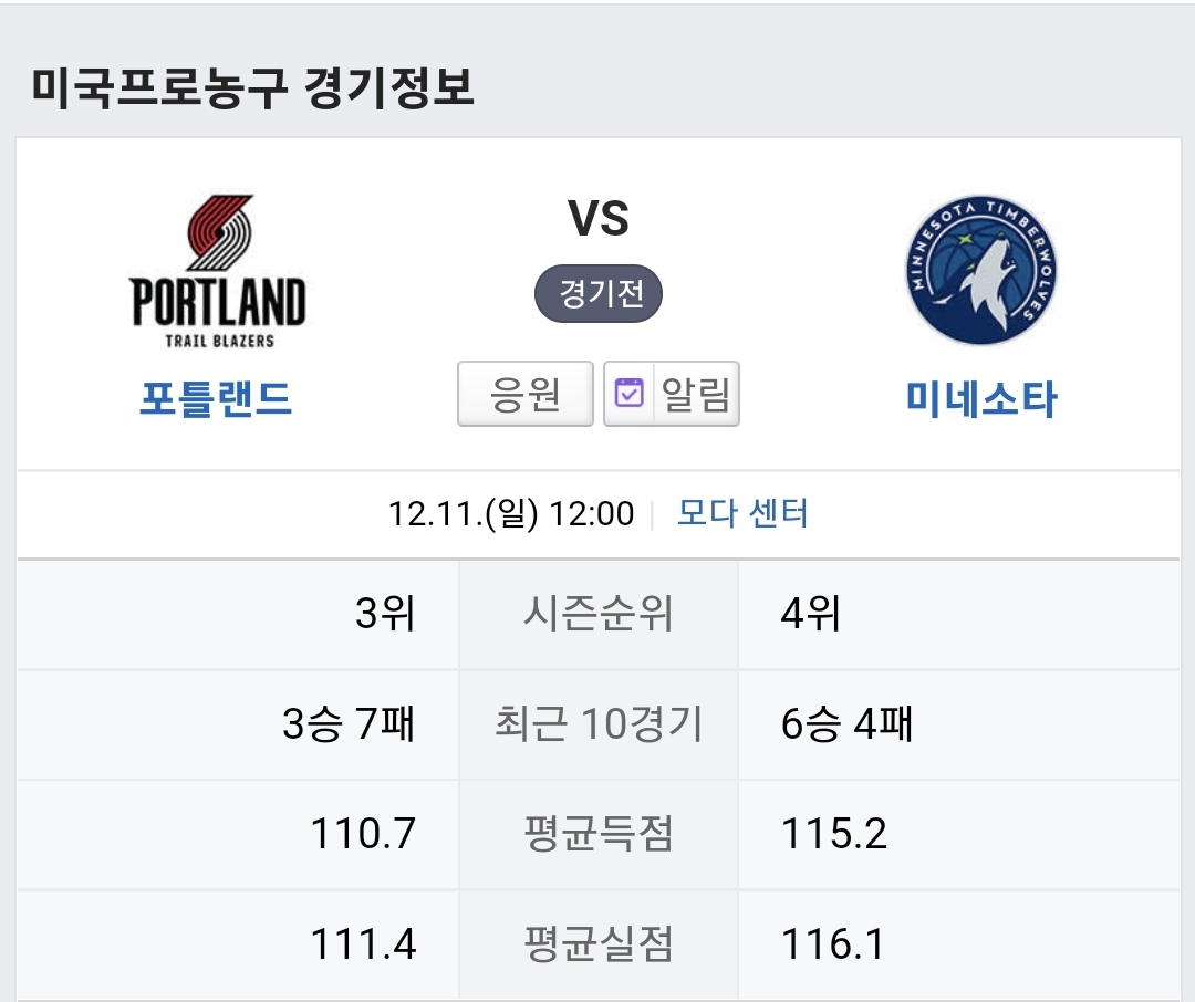 12월11일 NBA 포틀랜드:미네소타 승부예측