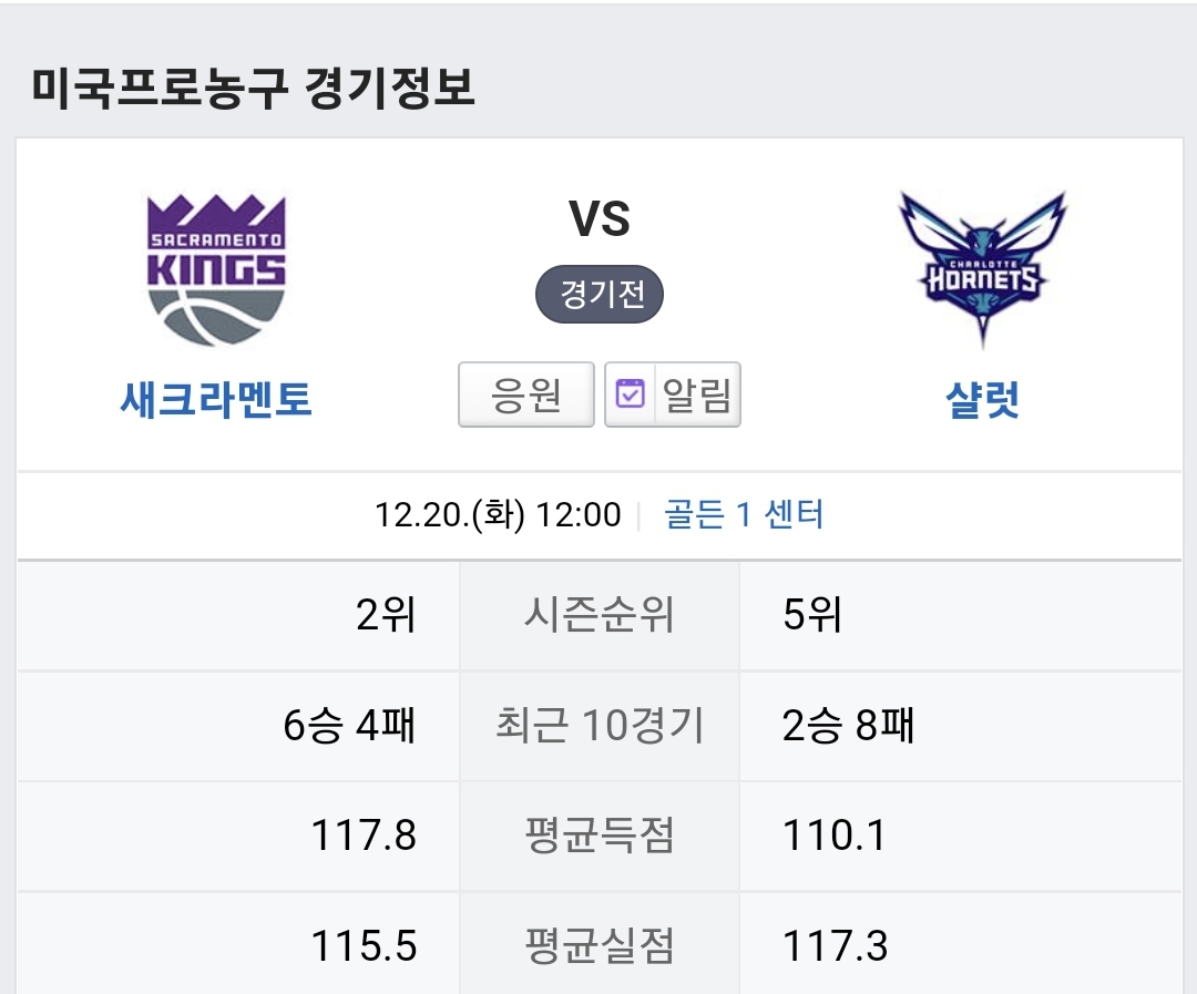 12월20일 NBA 새크라멘토:샬럿 승부예측 요약