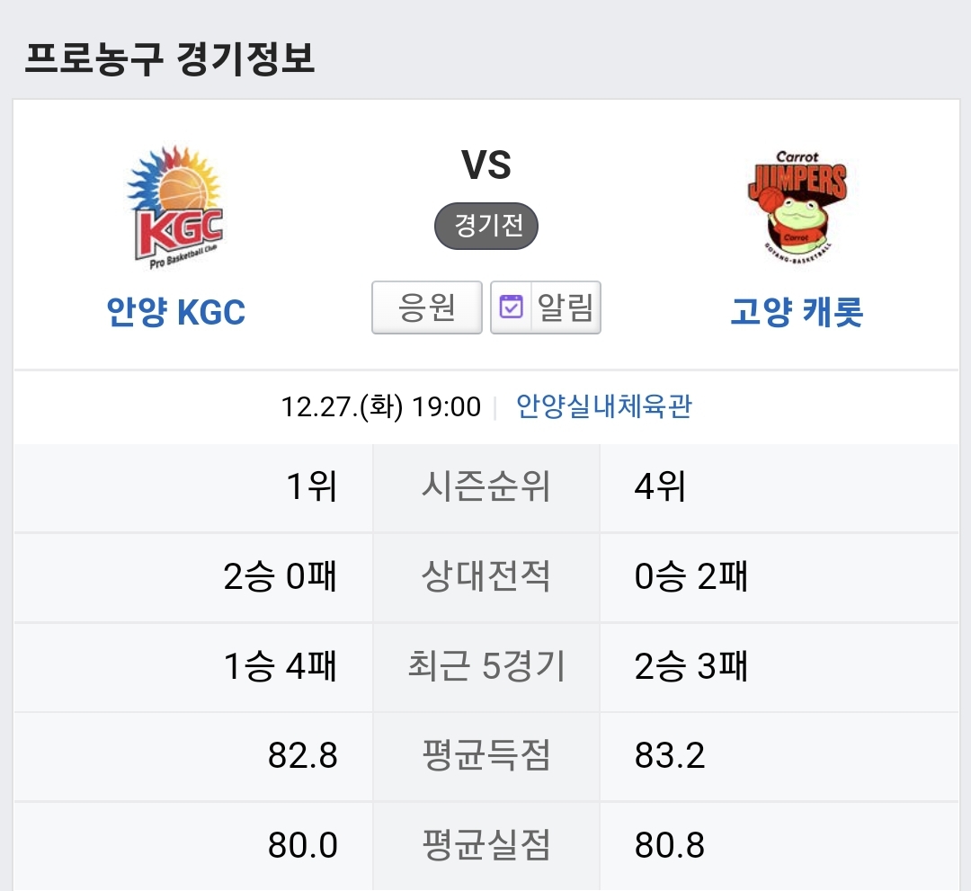 12월27일 KBL 안양KGC:고양캐롯 승부예측 요약